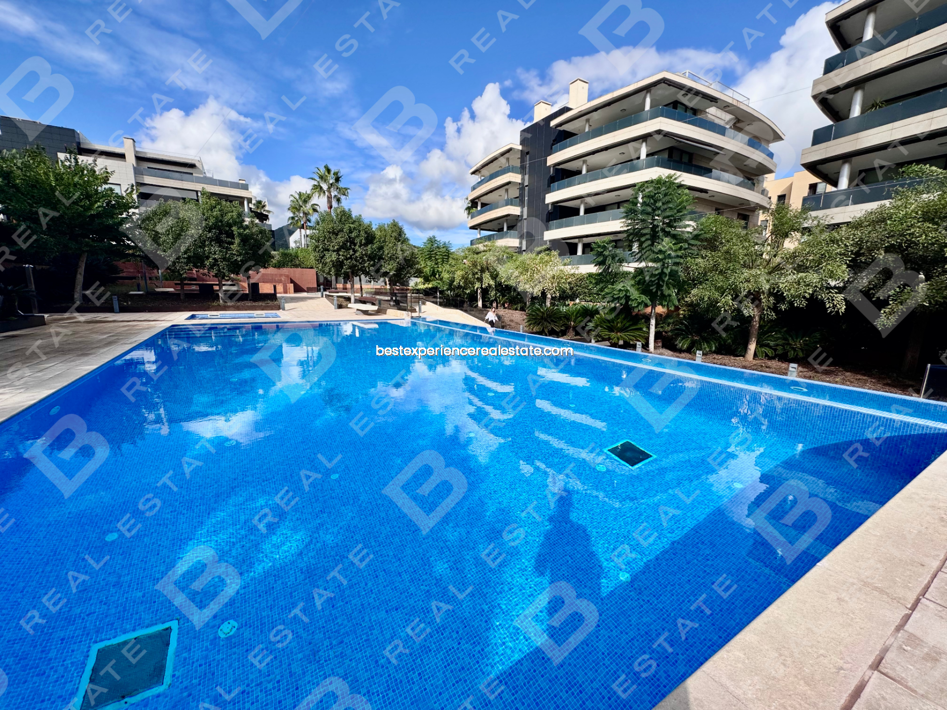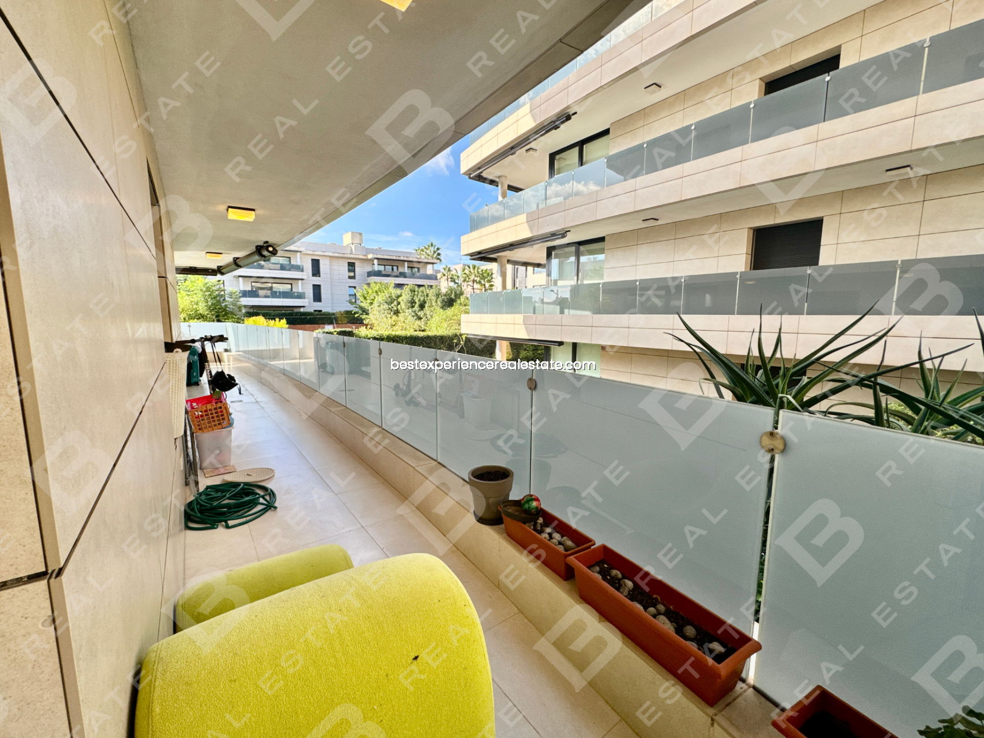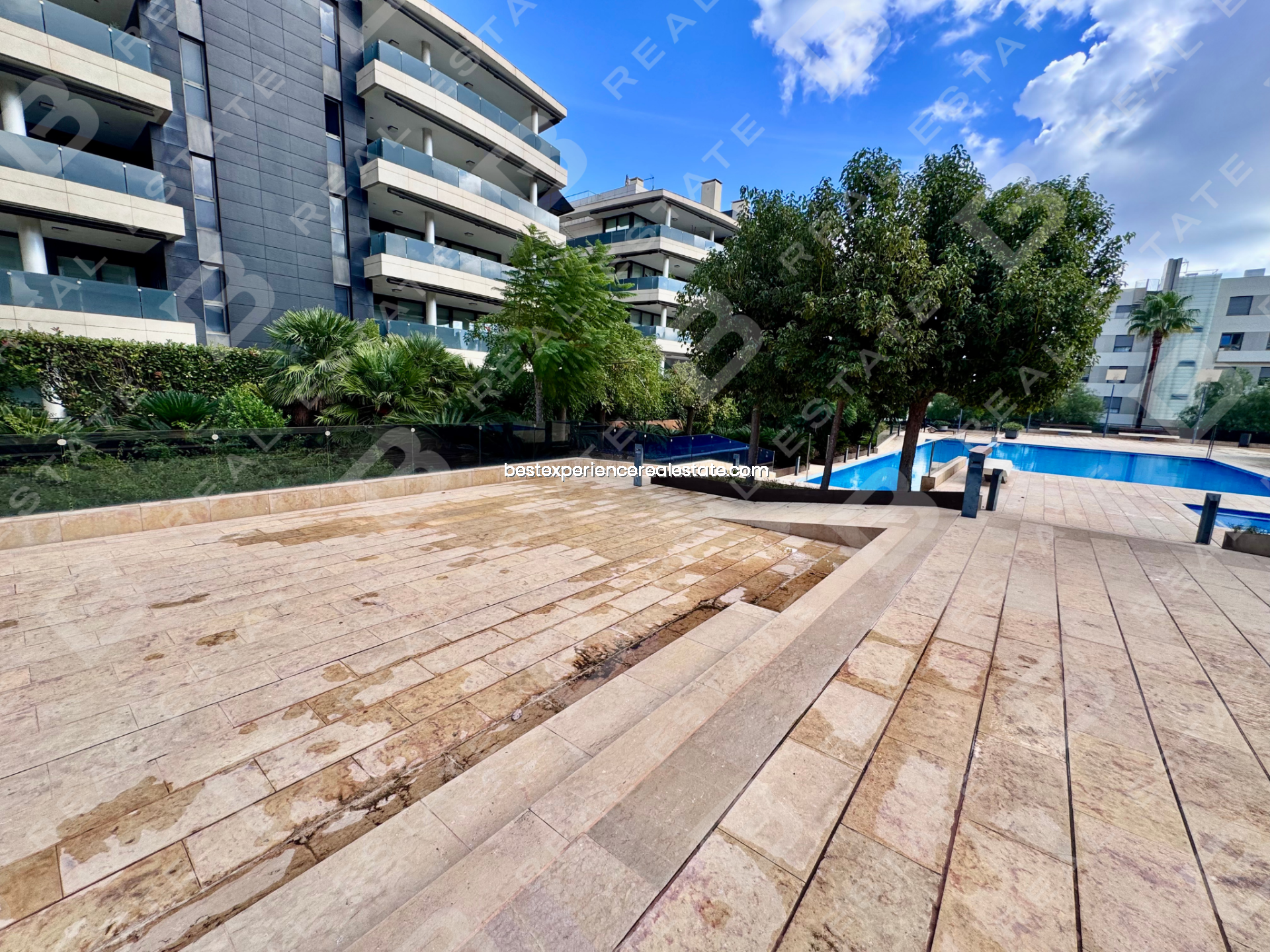 Este piso cuenta con 190 m² totales y una amplia terraza de 50 m² con orientación sur y vistas despejadas hacia las piscinas y jardines del residencial.