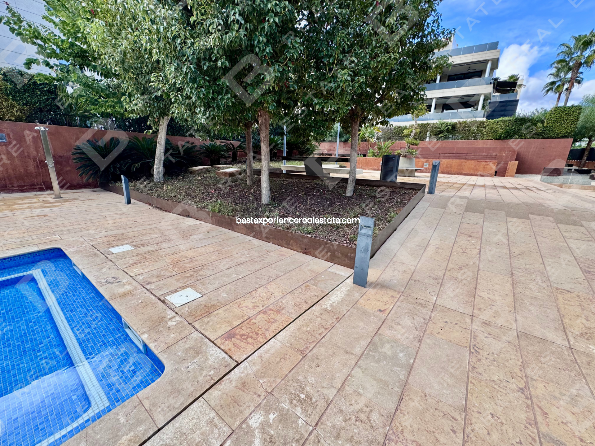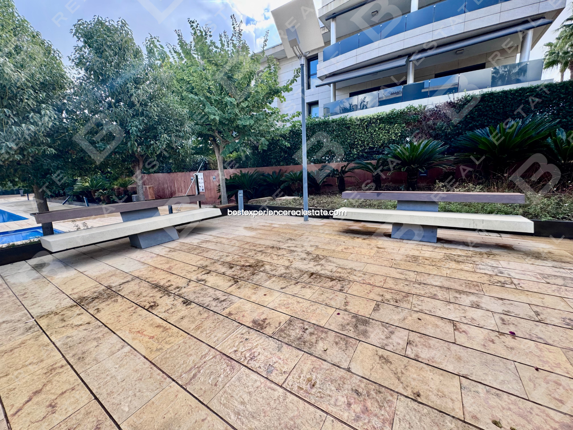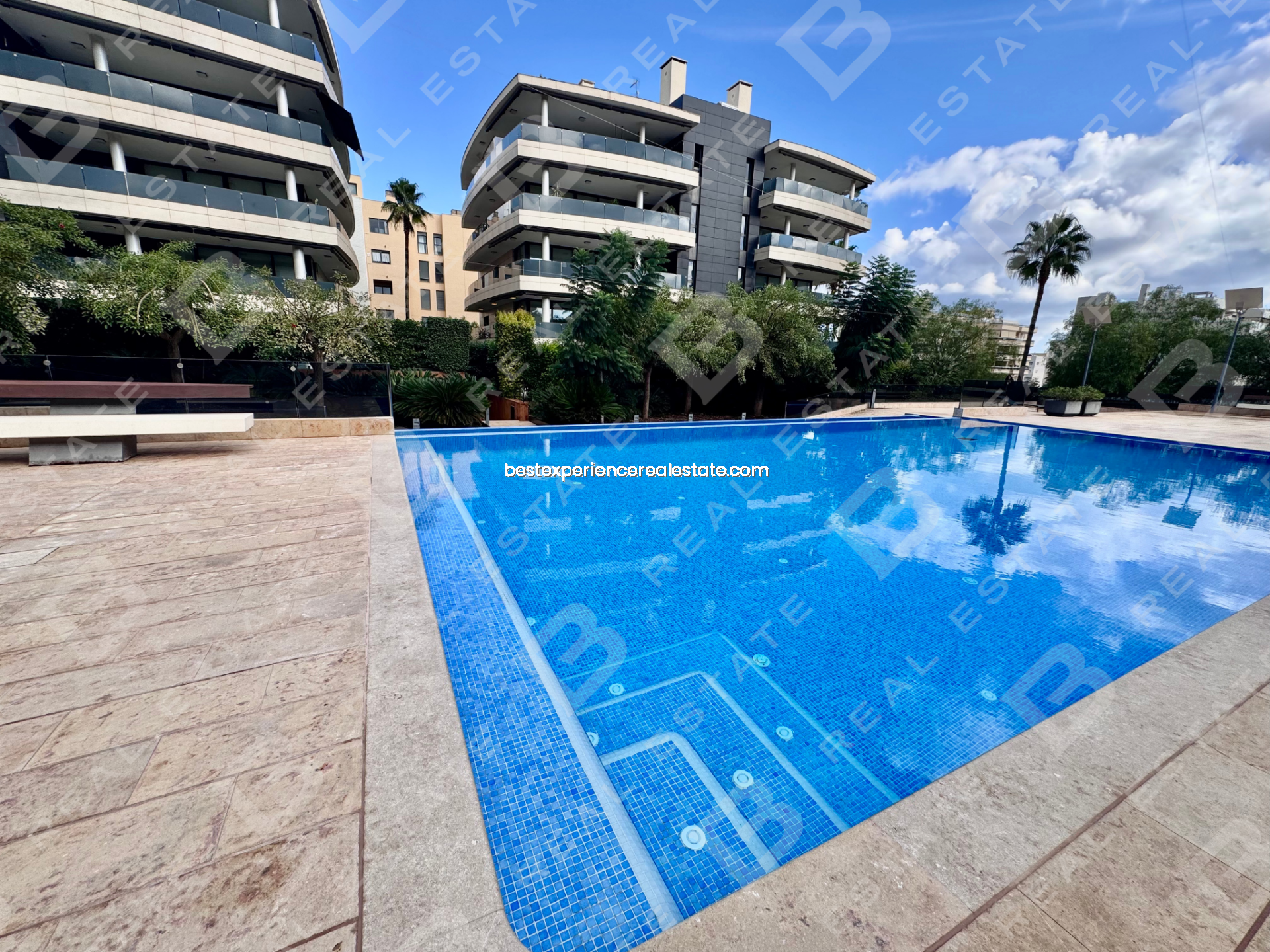 Este piso cuenta con 190 m² totales y una amplia terraza de 50 m² con orientación sur y vistas despejadas hacia las piscinas y jardines del residencial.